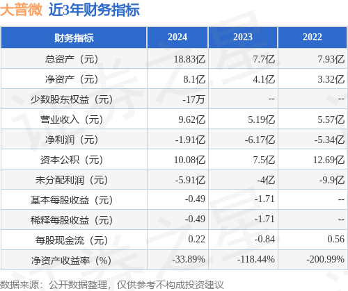 从目前公布的财报来看,大普微2024年总资产为18.83亿元,净资产为8.1亿元;近3年净利润分别为-1.91亿元(2024年),-6.17亿元(2023年),-5.34亿元(2022年)。详情见下表: